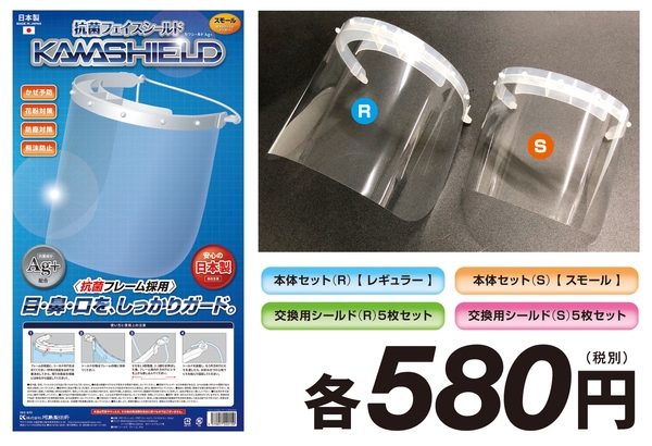 好評発売中のカワシールドAg+の「スモール版(小学校低学年から中学生までを想定)」を発売開始いたします。フレーム部分は、従来品に比べ軽量化と通気性向上を目指し改良。もちろん銀イオン配合の抗菌仕様。シールド部分は高透明なPET製を採用。簡単に取り替え&丸洗いして再利用可能。(上代580円+消費税)