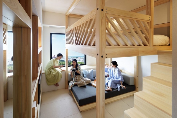客室は「やぐらルーム」、「ダブルルーム」、「ツインルーム」の3タイプです。床は和紙畳のため、靴を脱いで裸足でくつろげます。足を伸ばせるソファスペースや収納に使用する仕掛け壁、バス、トイレ別など、コンパクトながら機能的で使い勝手が良く、リラックスして過ごせます。「やぐらルーム」は、屋根裏部屋のような「やぐら寝台」が中2階にあり、秘密基地のようなワクワクする空間。寝台下のリビングスペースでは、語らいや食事など、寝るだけでは終わらない思い思いの過ごし方ができます。