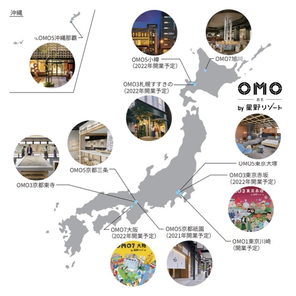 「OMO(おも)」は、星野リゾートが全国に展開する都市観光ホテルブランドです。ブランドコンセプトは「寝るだけでは終わらせない、旅のテンションを上げる都市観光ホテル」。地域と一体となって街を楽しみ尽くす旅を追求しています。すべての「OMO」で、街歩きをサポートするGo-KINJOサービスを展開。2022年春までに、OMO5京都祗園、OMO3東京赤坂、OMO3札幌すすきの、OMO5小樽、OMO7大阪の開業を予定しており、全国各地の11施設から「都市観光」の楽しさを発信していきます。