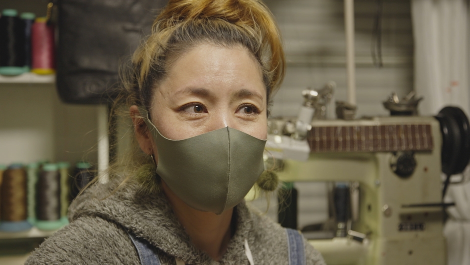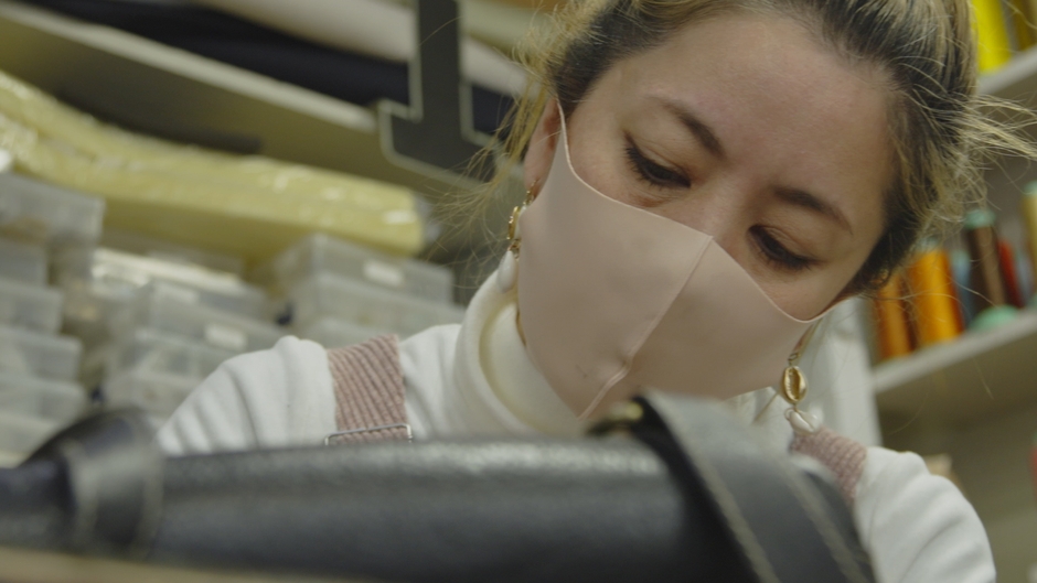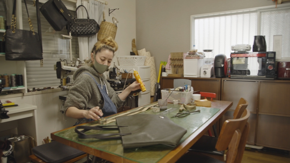 新型コロナの影響で小学生の学童保育がなくなったため、8歳と4歳の子どもの面倒を見ながらキッチンを作業場に仕事をはじめた松崎さん。取り掛かったのはルイ・ヴィトンのハンドバッグ。「ストラップを長くしてショルダーバッグに変更したい」というリメイクのオーダーです。元の品と違和感ない仕上がりにすることに加え、“使い心地の良さと長持ちさせること”が松崎さんのこだわり。ストラップにもいくつかの工夫が施されています。