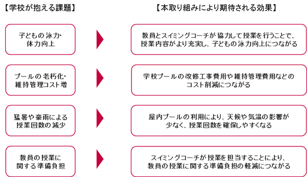 各地で学校プールの老朽化や維持管理に伴うコスト増加から、学校プールでの授業の継続が難しくなっており、子どもの水泳学習の機会の確保が課題となっています。また、猛暑や豪雨などの天候不順による授業回数の減少や教員の水泳授業準備への負担など複数の課題に対し、民間スイミングスクールが水泳授業に協力することで、これらの課題を解決し、子どもの水泳学習や体力づくりへの貢献が期待されています。