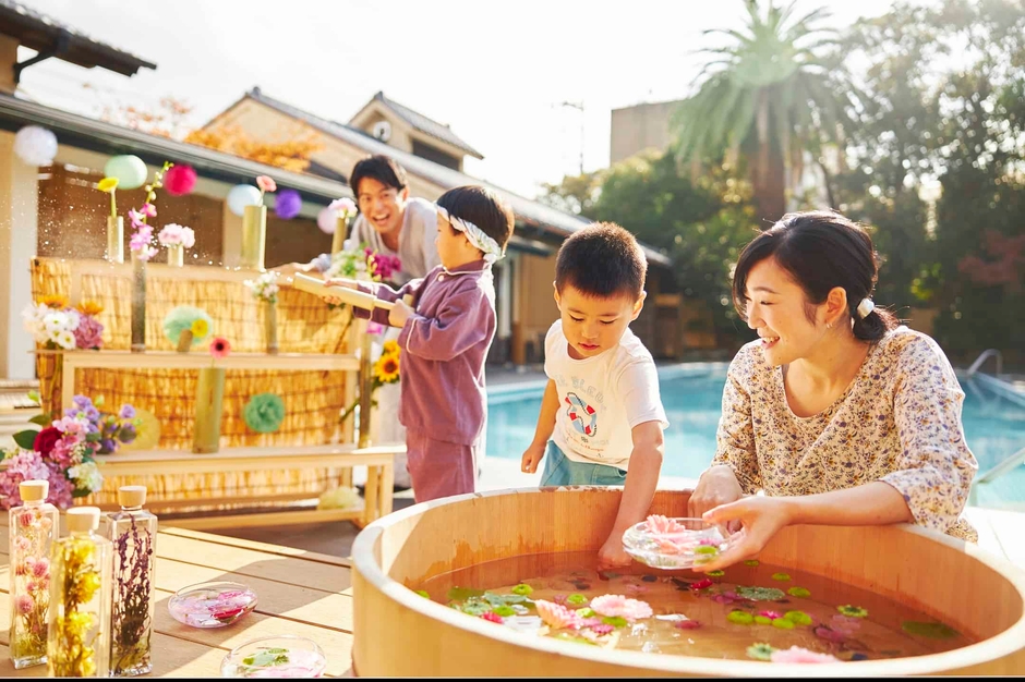 全館源泉かけ流しの美肌の湯を堪能できる温泉旅館「星野リゾート 界 伊東」では、2020年8月1日~31日までの期間、伊東の夏を家族で楽しむ「温泉花あそび」をご提案します。一年を通して花が咲いている伊東にちなみ、水に浮かべた夏の草花をすくう、金魚すくいならぬ「花すくい」や、水鉄砲をイメージし、竹筒に源泉を入れて花をあしらった的を撃つ「源泉でっぽう」など、夏定番の体験に伊東らしさを加えました。界 伊東の敷地内にある約 300 坪の日本庭園という開放的な空間で、お子様から大人まで家族みんなで夏の思い出を作ることができます。