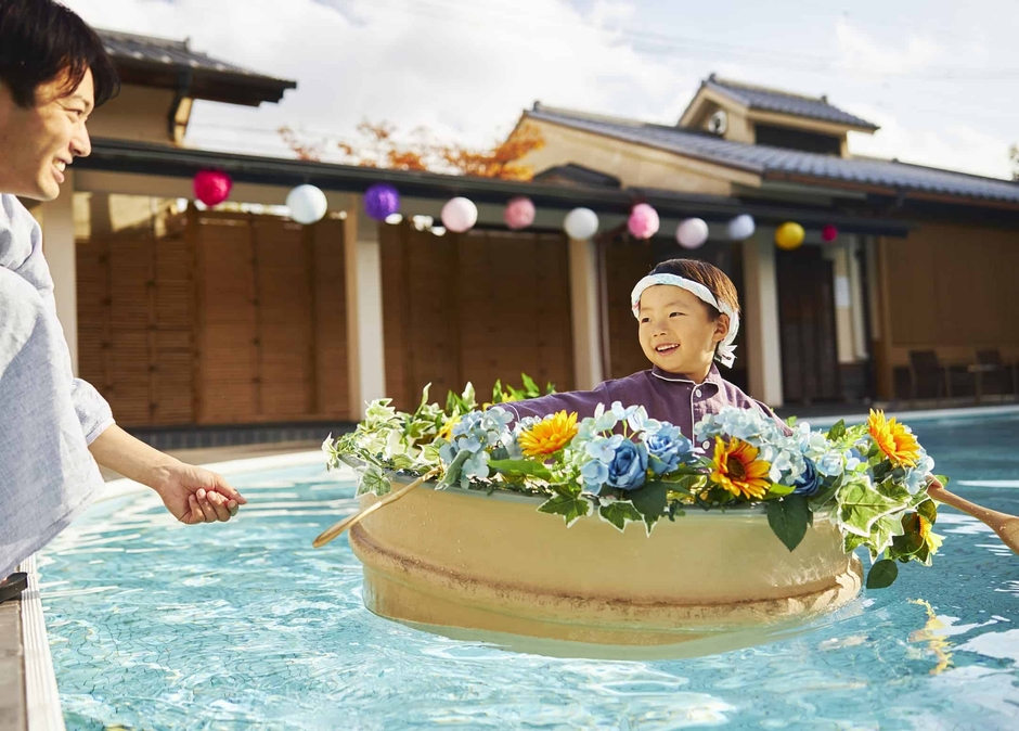 伊東市で約60年続く夏のお祭り「松川たらい乗り競争」にちなみ、源泉プールに大きなたらいを浮かべ、しゃもじのようなカイで漕ぐたらい乗り体験ができます。頭には伊東市の市花である椿や、夏の花の梅花藻(ばいかも)などが描かれた手ぬぐいをまいて、色とりどりの夏の花をあしらった花たらいに乗ります。親子で乗れる大きなたらいも用意していますので、一緒に楽しめます。
