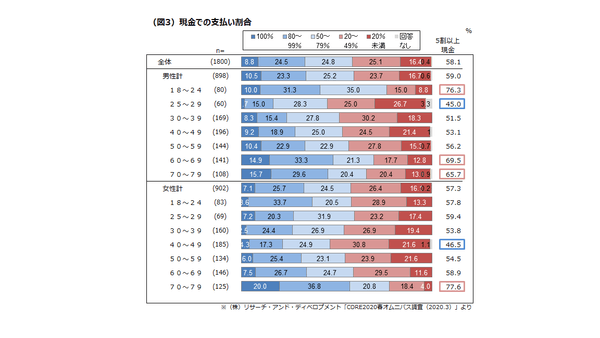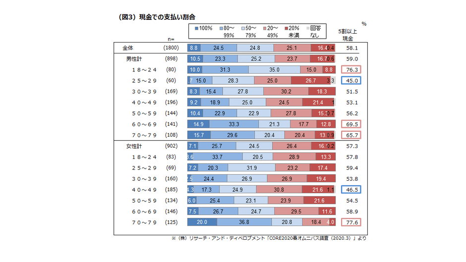 ●現金での支払割合では、100%現金払いが全体で8.8%。女性70代で20%、男性60~70代は約15%と高齢者が多い。(図3)
