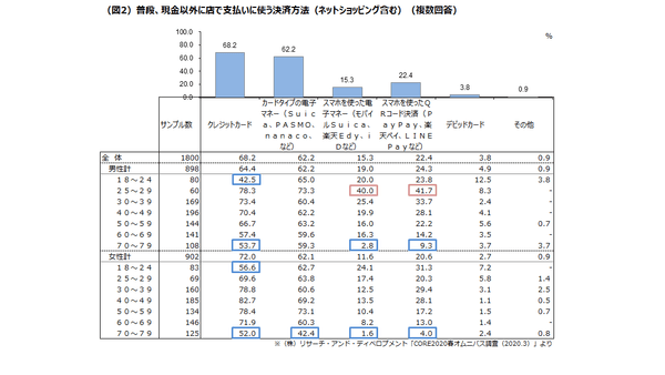 ●利用している決済方法は「クレジットカード」と「カードタイプの電子マネー」が6割を超える。「スマホを使った決済(電子マネー・QRコード)」は2割程度で年代による差が大きい。(図2)