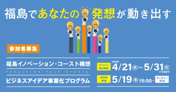 5月31日(火)17時締切。 福島で新たな産業基盤の構築を目指す国家プロジェクト 「ビジネスアイデア事業化プログラム」エントリー受付中。