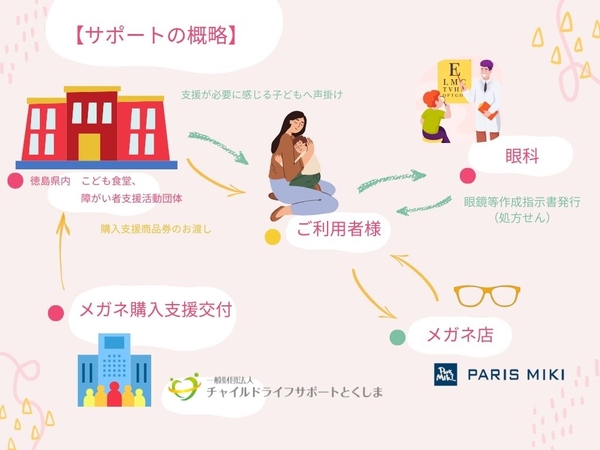 株式会社パリミキ(本社:東京都港区、代表取締役社長:恒吉 裕司、以下「パリミキ」)は子どもの健全な育成を目的として、一般財団法人チャイルドライフサポートとくしま(理事長 大塚 芳紘、以下「CLS」)の支援をいただき、徳島県内のこども食堂、障がい者支援活動団体の協力のもと、経済的な事情などでメガネを購入することができない世帯の子どもたちを対象に、教育環境の改善や保護者の負担軽減につなげてまいります。