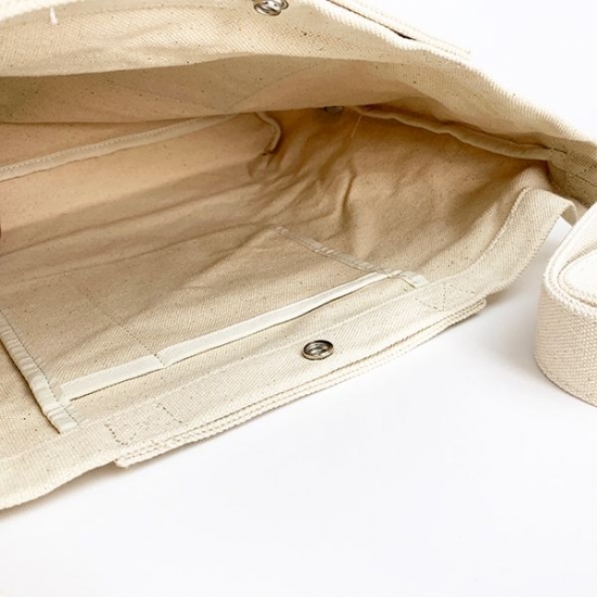 まずは、帆布素材のショルダーバッグです。アイボリーカラーのナチュラルな色合いは、どんな服装にも合わせやすくて使えます♪布素材なので軽いのも、オススメのポイント。前面には、大きなポケットもついていて機能的です。