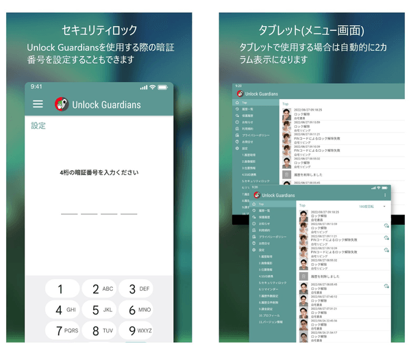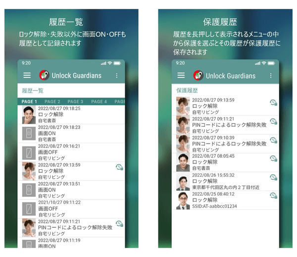 Unlock Guardians(アンロックガーディアンズ)は上記の様な問題を解決する手段として、24時間365日、常にスマホやタブレットのロック解除操作者を日時分だけではなく顔画像や位置情報まで記録・確認できる様にすることで不正な侵入を防止する事を目的として開発されたAndroid向けアプリケーションです。