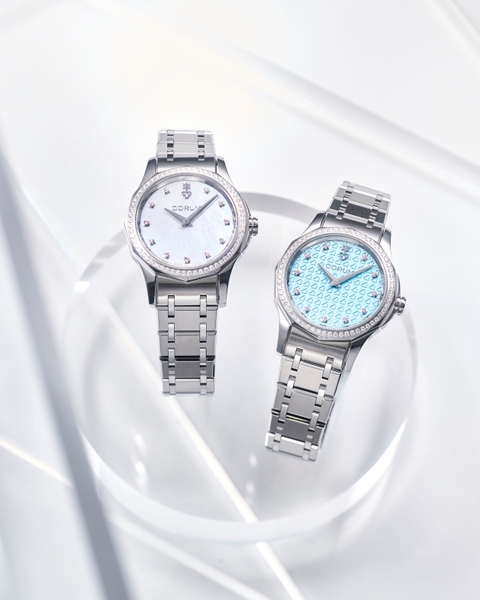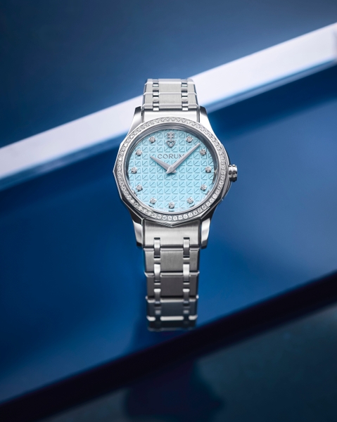 個体ごとに異なる模様を持つ天然素材のマザー・オブ・パールを採用したダイアルと、ヨットの帆をイメージしたコルム独自のエンボス加工を施した淡く優しいベビーブルーダイアルの2バリエーション。インデックスには、12時位置にブランドエンブレム、1~11時位置にダイヤモンドを配しています。