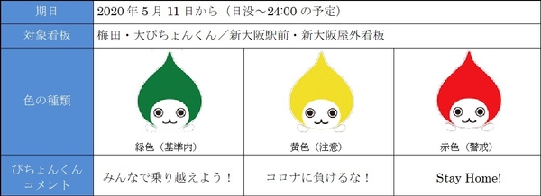 大阪府は2020年5月5日に府独自の基準に基づく自粛要請・解除および対策の基本的な考え方として「大阪モデル」を発表しました。大阪モデルの達成状況は「大阪府新型コロナ警戒信号」として府のホームページで表示され、「通天閣」および「万博記念公園 太陽の塔」で警戒信号のライトアップが行われます。当社は、この大阪一体で進められる取り組みに賛同し、大阪最大のオフィス街・繁華街である梅田と、大阪の玄関口である新大阪駅前に設置している2つの看板の「ぴちょんくん」の色を、警戒信号に合わせてライトアップすることにしました。「大阪モデル」の達成状況を「見える化」し、より多くの府民のみなさまに今の状況を知っていただくことで、新型コロナウイルス感染症の収束に向けた一助になれば幸いです。