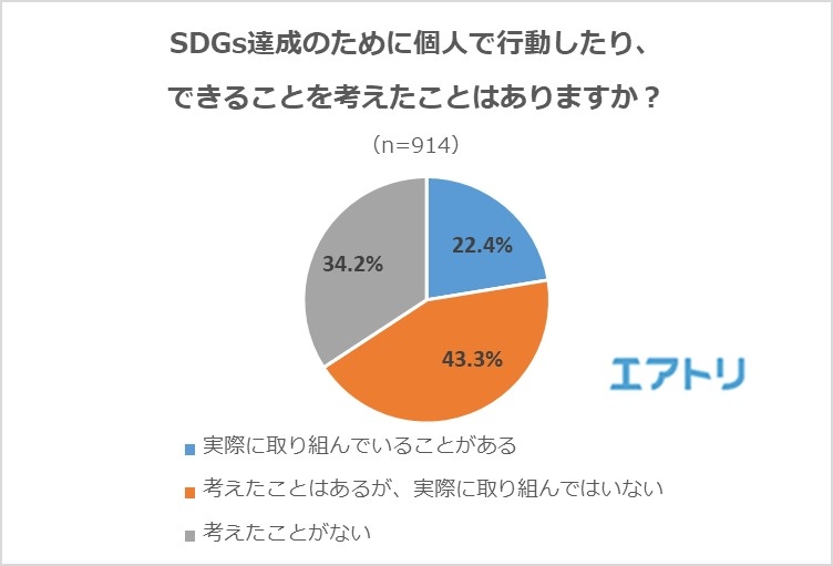 SDGsの達成のためには国や企業だけでなく“個人”でも取り組む必要があり、できることがたくさんありますが、個人で「実際に取り組んでいることがある」人は22.4%、「考えたことはあるが、実際に取り組んではいない」は43.3%となりました。SDGs達成のための行動を意識したことがある人が65%以上にも上り、意識改革は進んでいるように見受けられました。