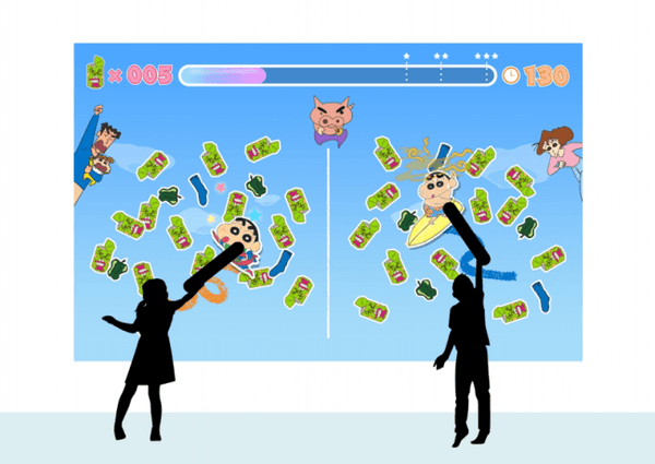 4種類のしんちゃんが印刷されたぬりえシートの中から好きなものを選び、ぬりえをします。そして、その絵をスキャンすると、自分がぬりえで描いたしんちゃんが壁に出現。参加者はクレヨン型のスティックバルーンを使って、しんちゃんを動かして“ピーマン”や“ひろしのくつした”を避けながら、”チョコビ“をどれだけゲットできるかにチャレンジします。