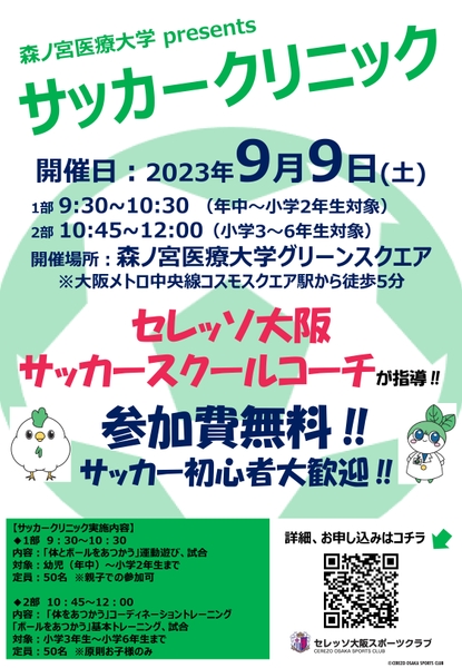 9月9日(土)「セレッソ大阪スポーツクラブ」と協力して、年中~小学6年生向けの「サッカークリニック」を開催いたします。セレッソ大阪のサッカースクールコーチに直接ご指導いただける貴重な機会です。※申込は締切ました。