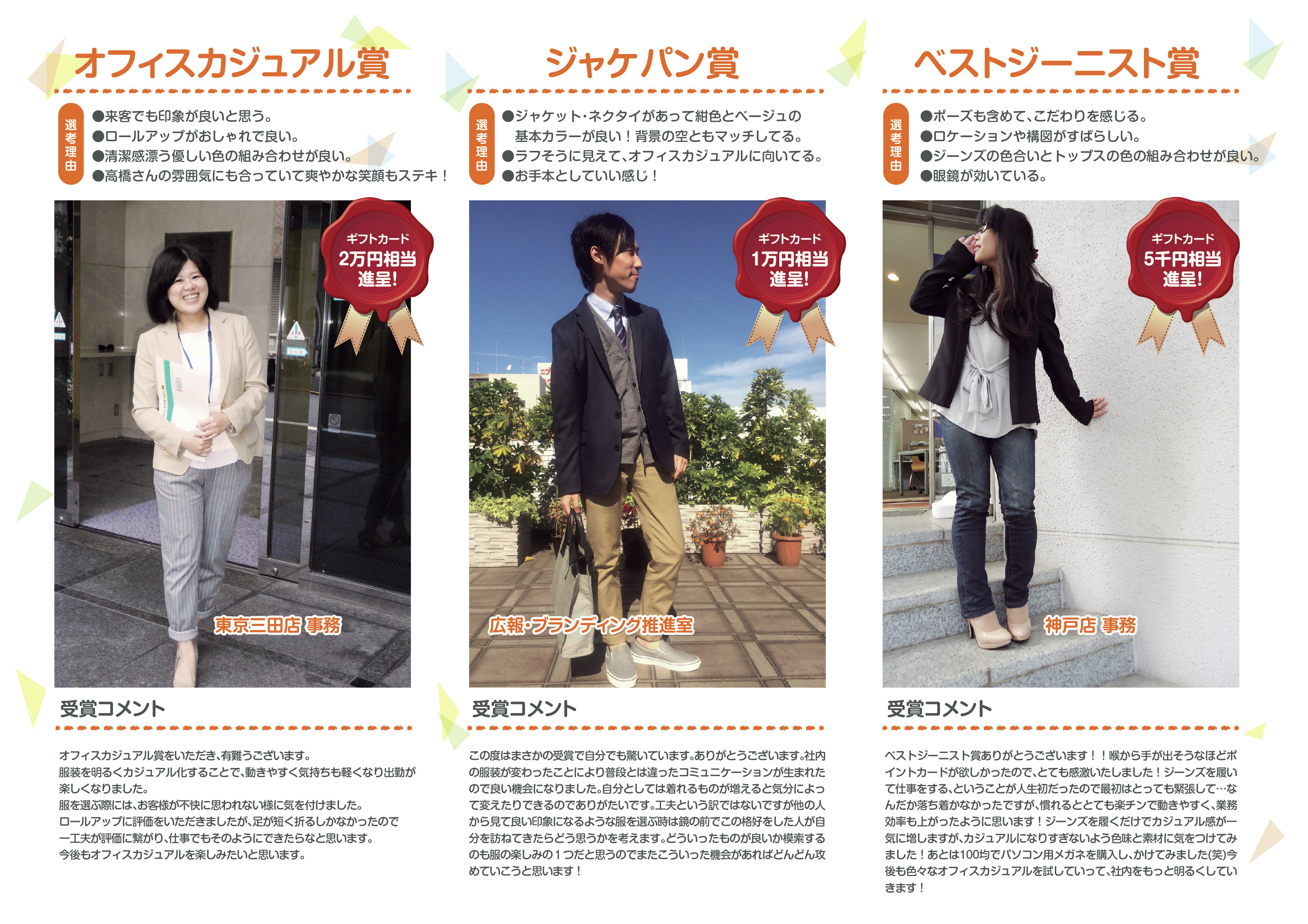 その方法は、社員より個々に思う自身のオフィスカジュアルスタイルの写真を募集し、オフィスカジュアル化プロジェクトメンバーが、写真を選別しながら「オフィスカジュアル賞」などの賞の選定、Q&A、基準設定までを行いました。