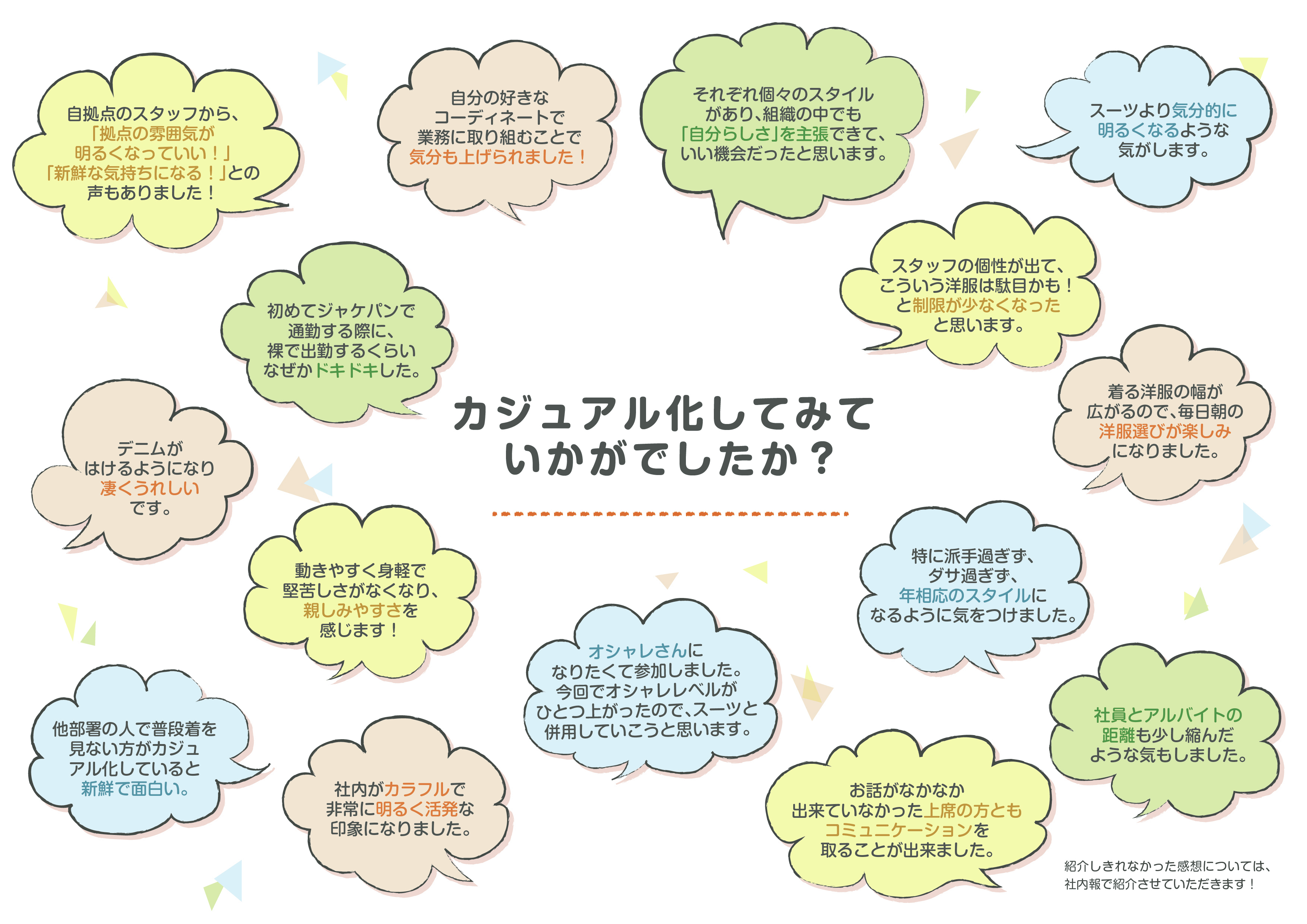 とつとして、また、実際にカジュアル化を体験した社員の多くから、前向きな声が上がりました。
