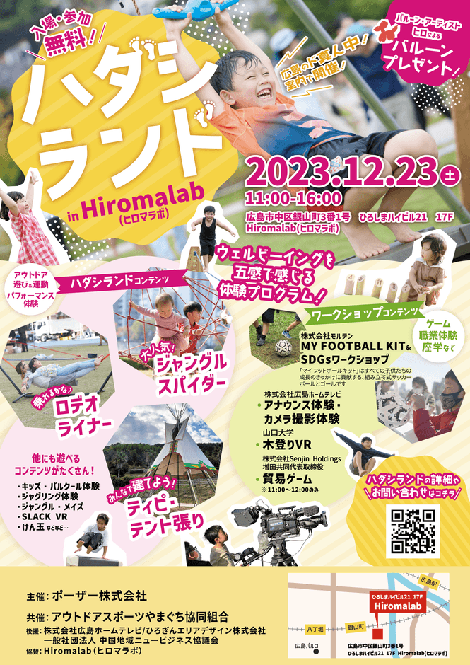 このイベントでは、子どもたちがハダシで遊べるプレイパークを広島中心部のビル屋内で開催します。ウェルビーイングを五感で感じることができるアウトドア遊びや運動パフォーマンス体験、また頭を刺激するワークショップなど様々なコンテンツが満載、情緒豊かな子供を育む体験プログラムが提供されます。