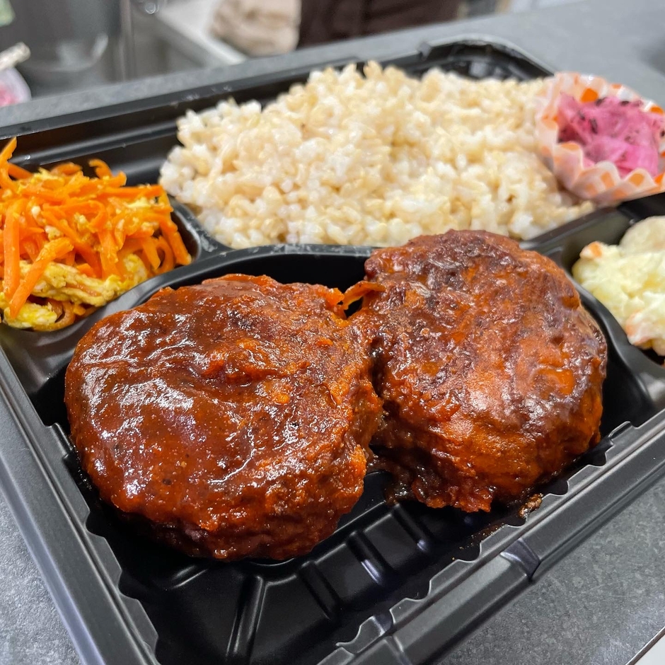 間借り時代の人気メニュー「Wハンバーグ弁当」540円などこだわりの手作りメニューを日替わりで提供致します。ご飯は圧力鍋で炊いたふっくらご飯と玄米が選べます。