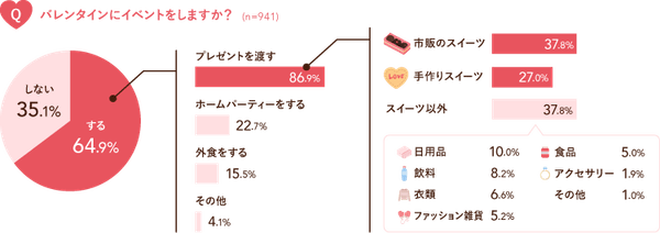バレンタインに何かしらのイベントをすると答えた人のうち、86.9%が「プレゼントを渡す」と回答しました。また、「プレゼントの内容」について聞いたところ、37.8%が市販のスイーツを購入すると回答し、手作りスイーツを上回りました。また、37.8%が日用品や飲料、衣類などの「スイーツ以外のプレゼント」を渡すと回答し、スイーツ以外の品物がバレンタインプレゼントでも一般的になっていることが明らかとなりました。