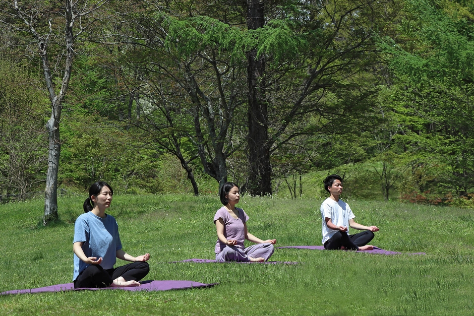 「Fun & Active(ファン&アクティブ)」は、仲間と楽しく身体を動かす動の心身調律です。開放感ある芝生の上で、ストレッチによるウォーミングアップから始まります。その後、カラマツの丸太でできたトレーニングツールで全身を動かし、森の生き物の動きを取り入れたリレー形式のエクササイズで楽しく盛り上がります。そして、最後に全身を思いっきり動かす運動がサーキットトレーニング(筋肉運動と有酸素運動を合わせたもの)です。ゲーム感覚で身体を動かすことで、心と体に活力を取り戻すことを目指しています。