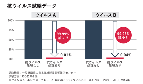 今回開発した抗ウイルスフローリングは、SIAAが定める「特定ウイルス※が24時間後に99%以上減少すること」という基準に対して、「ウイルスA(エンベロープあり)で99.99%、ウイルスB(エンベロープなし)で99.96%減少」というどちらのウイルスに対しても高いレベルで合格することができました。 また、配合している無機系抗ウイルス剤は、安全性で十分な実績があるとともに、光を必要とせず、空気の動きが止まりウイルスが床に溜まる夜間、暗所でも十分な効果を発揮します。