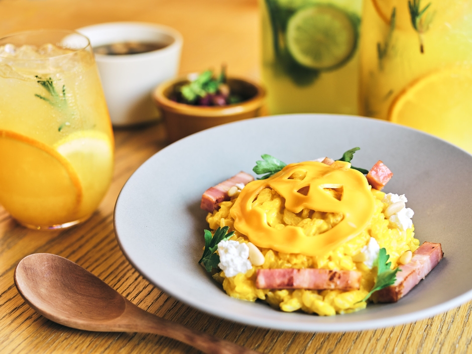 翌朝は館内の「OMOカフェ」にて、お酒を飲んだ後にぴったりの朝食メニューを楽しめます。お腹にやさしいリゾットや、ハーブやフルーツを使ったさっぱりとしたフレーバーウォーターのドリンクを用意。リゾットは「生ハムジェノベーゼ」や「深川あさり」など、全7種類から選べます。中でも「かぼちゃリコッタ」のリゾットは、期間限定でジャック・オ・ランタンの形をしたチーズがトッピングされているので、はしご酒の翌朝もハロウィン気分を楽しむことができます。