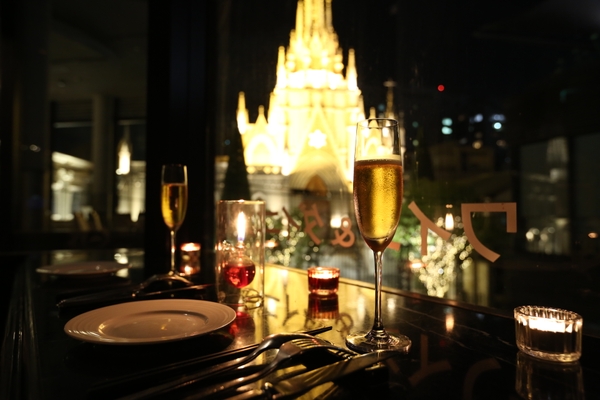 店内の全席から、黄金色にライトアップされた「青山セントグレース大聖堂」を望めるロマンティックな空間で楽しむ夜のアフタヌーンティーは、グラススパークリングワイン、コーヒー・紅茶の飲み放題もついて、アフターファイブでの夜の女子会にもおすすめです。美しいスイーツとともに、ゆったりとしたひとときをお過ごしください。