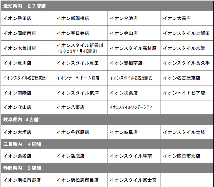 販売店舗:愛知・岐阜・三重・静岡県内「イオン」「イオンスタイル」合計38店舗※1