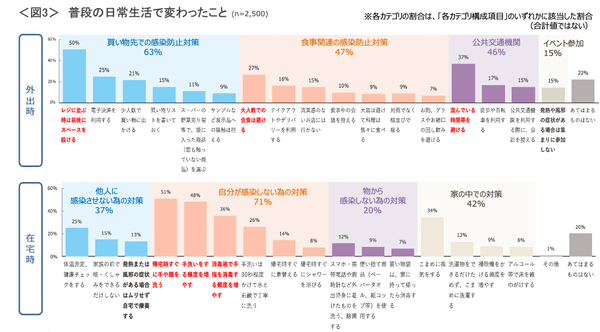 今回調査では“普段の日常生活で変わったこと”について、外出時・在宅時それぞれで聴取した。