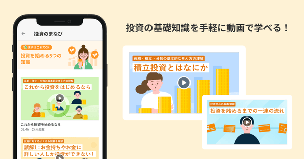 「投資のまなび」は、『マネーフォワード ME』アプリ内で視聴することができるオリジナル動画※5です。投資を始めるまでの不安や悩みの解消を目指し、実際に投資を始めるまでの「入門」編として、1本あたり約3分の動画を計17本公開します。「入門」編の動画で得た知識をもとに投資をスタートさせた後も学び続けられるよう、今後も「初級」「中級」「上級」のレベル別に動画を公開予定です。