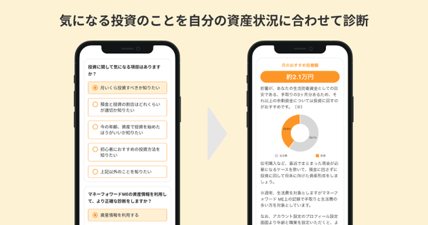 「月いくら投資すべきか」「預金と投資の割合はどれくらいが適切か」「今の年齢、資産で投資を始めたほうがいいか」など、『マネーフォワード ME』に連携している資産の状況※6から、投資額や投資を始めるタイミングの診断結果を表示します。