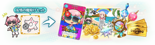 本イベントで獲得した「友情の魔除けセット」は限定メモリア「史上最強のメモリア(自称)」や、限定ホーム背景「神浜スパアドベンチャー」等の貴重なアイテムと交換できます。
