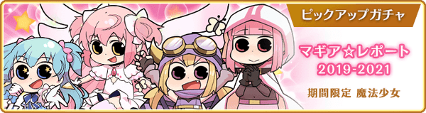 『期間限定 マギア☆レポート2019-2021 ピックアップガチャ』では、下記ピックアップ対象の魔法少女およびメモリアの提供割合がアップしております。