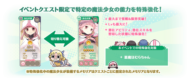対象の魔法少女を編成して本イベントクエストをプレイする際に、ステータスを特殊な状態に強化することができます。