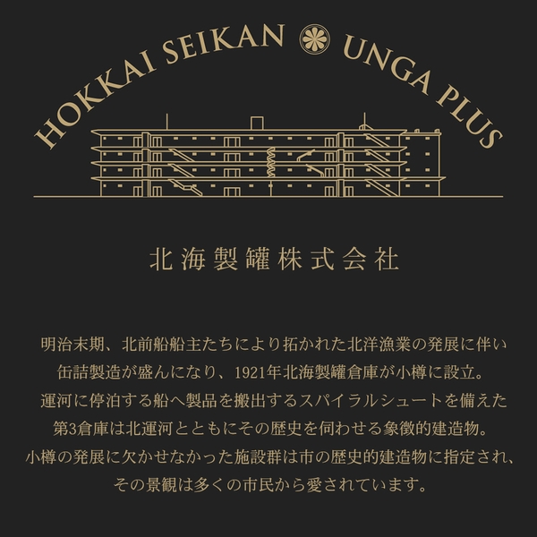 明治末期、北前船船主たちにより拓かれた北洋漁業の発展に伴い缶詰製造が盛んになり、1921年北海製罐倉庫が小樽に設立。運河に停泊する船へ製品を搬出するスパイラルシュートを備えた第3倉庫は北運河とともにその歴史を伺わせる象徴的建造物。小樽の発展に欠かせなかった施設群は市の歴史的建造物に指定され、その景観は多くの市民から愛されています。