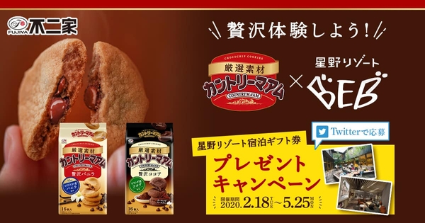 不二家公式Twitterにて、星野リゾート宿泊ギフト券5万円分と「厳選素材カントリーマアム(贅沢バニラ)/(贅沢ココア)」のセットが、合計7名様に当たるプレゼントキャンペーンを実施します。