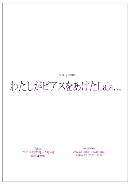 エンターテイメントプロジェクトNBO(ンボ)のプロデュース公演『わたしがピアスをあけたLala…』が、東京公演として11月30日(水)~12月4日(日) 劇場MOMOで、福島公演として12月17日(土)~18日(日)会津坂下町中央公民館にて上演されます。チケットはカンフェティ(運営:ロングランプランニング株式会社、東京都新宿区、代表取締役:榑松 大剛)にて発売中です。
