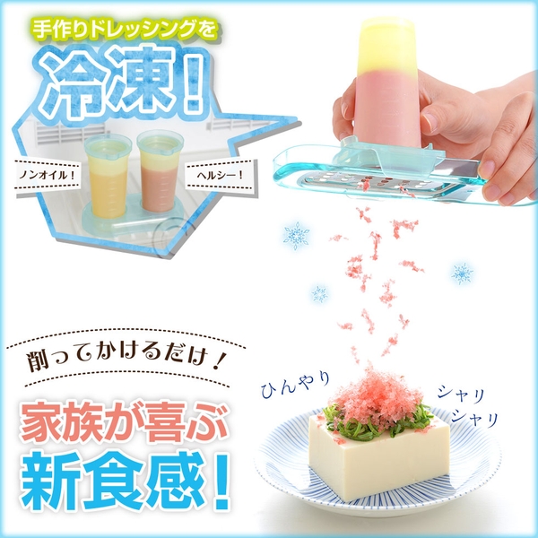 手作りのドレッシングを冷凍庫で凍らせて、削ってかけるだけで、ひんやり&シャリシャリの新食感の「お涼理」になります。