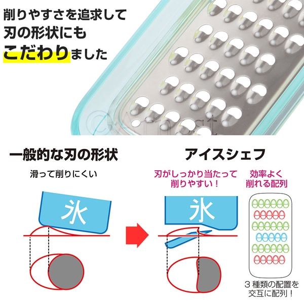 氷を効率良く削るために、刃の形状もこだわりの新設計。しっかりザクザクと削ることができます。