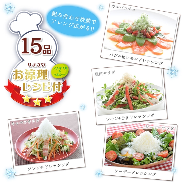 オリジナルの15品のノンオイルドレッシングレシピ付きなので、組み合わせ次第で色々な味にアレンジができます。