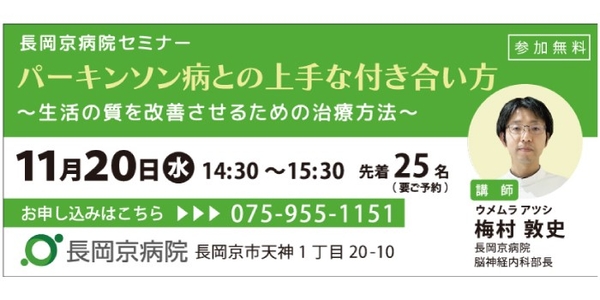 【満員御礼】長岡京病院 11月20日(水)に、パーキンソン病に関するセミナーを開催! パーキンソン病との上手な付き合い方 ~生活の質を改善させるための治療方法~
