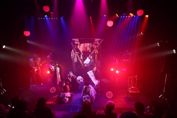 ゲストライブは、a_kira率いる「天使乃聲」。天井桟敷の劇中歌や、当時のコンサートで歌われたJ・A・シ ーザー曲を演奏します。中でも1970年代に新⾼けい⼦によって⼀度だけ歌われた幻の名曲を再現するほか、演奏曲⽇替りでライブを⾏います。 終演後も60分間、BARタイム続⾏するので、キャストとの交流 や⽝神の⼥コラボカクテル『⾚い⽉』や、この⽇のために撮り下ろした舞台『仮⾯劇・⽝神』⾐装によるキャストブロマイド販売など、余韻を味わうお楽しみも⽤意されています。