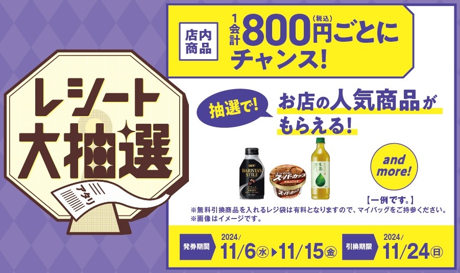 800円(税込)お買い上げごとにレジで自動抽選し、当選すると商品無料引換券がもらえます。