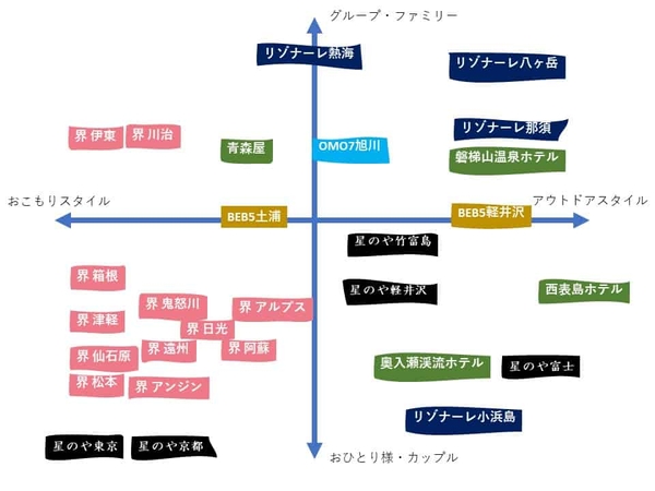 ラグジュアリーブランド「星のや」、温泉旅館「界」、リゾートホテル「リゾナーレ」、都市観光ホテル「OMO」、ルーズなホテル「BEB」の5ブランドを中心に、国内外で42施設を運営。