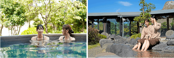 美容や疲労回復の効果が期待される高濃度炭酸泉の「池泉庭園の湯」や、夜はライトアップで幻想的な雰囲気になる「五色の湯」、そして地下1,400メートルから湧き上がる温泉が溢れる「源泉館」など、いずれも水着着用で男女一緒にお楽しみいただけるのでグループやカップルにお薦めです。