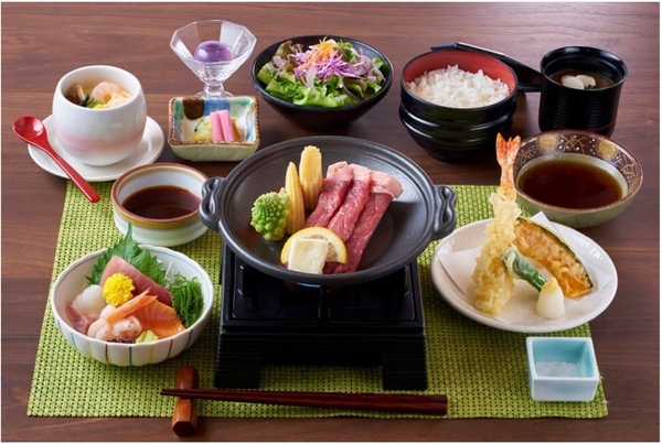 写真:お肉もお造りも、天ぷらも!ボリュームと美味しさに定評のある「にぎわい千寿樓御膳」(2,068円)