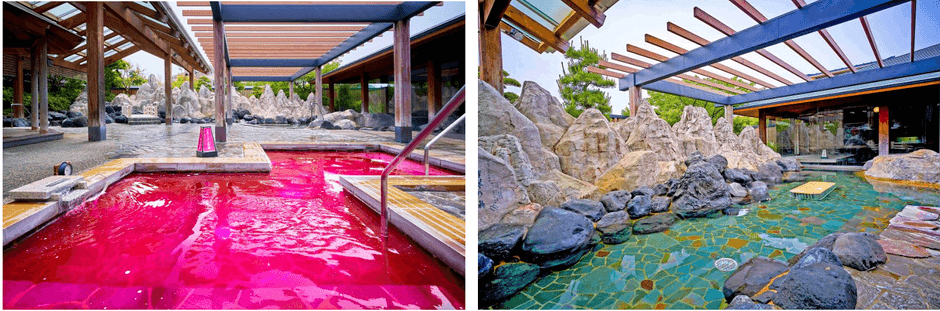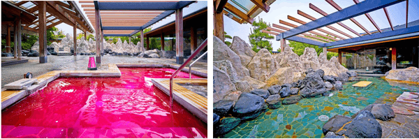左:甘い香りと華やかな色合い、とろりとした湯で長湯必至の「コラーゲンの湯」