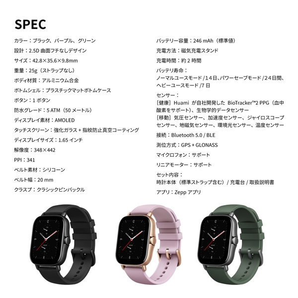 最新のフィットネストラッキング機能と超薄型でファッショナブルなデザインを特徴とするAmazfit GTS 2、今日のアクティブな消費者のためのスタイルと健康の完璧なブレンドを表し、また、余分な長いバッテリー寿命と妥協のないエレガンスを提供します。
