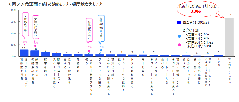 食事面で「新たに始めた」ことがある人の割合は3割程度。 乳酸菌や発酵食品といった免疫面にも効果がありそうな“身近な”食品摂取がコロナ太り対策として取り入れられている。