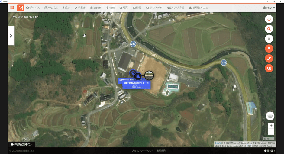 本セミナーでは、コロナ時代の最新活用事例やドローンやスマートフォン等の各種IoT機器から取得してきた情報を地図画面上に集約して遠隔から確認できるリモート情報共有プラットフォーム「Hec-Eye(ヘックアイ)」について、運用のデモンストレーションを交えた説明を行い、リアルタイム情報共有システムとドローンおよびスマートフォンを連携させて活用することで、日常的な業務や災害対応等でどのように役立てることができるか、講演を行いました。